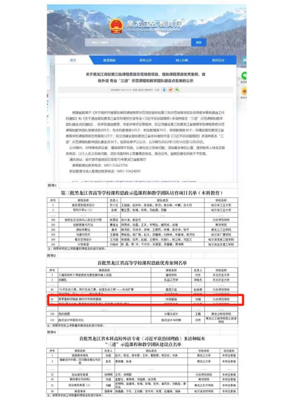 近日,在黑龙江省教育厅组织的首批高校课程思政优秀教学案例遴选工作中,经组织推荐、专家遴选、会议评选和网络公示等程序,太阳成集团tyc33455cc官网刘楠老师主讲的《市场营销学》中的新零售数字赋能、新时代可持续营销案例获首批黑龙江省高等学校课程思政优秀案例。希望全院教师以此次为契机,深入挖掘专业课程本身所蕴含的思政元素,探索和创新课程思政建设方法,进一步深化课程思政教学改革,强化课程育人导向。