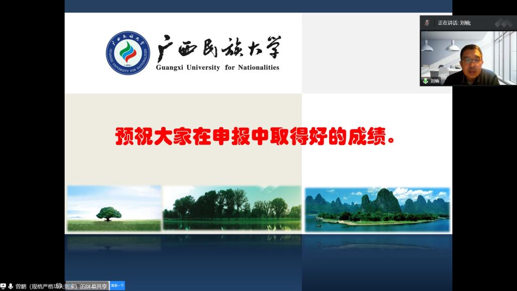 2月10日下午,广西民族大学研究生院院长,重庆大学、广西大学、广西民族大学博士生导师、博士后合作导师曾鹏教授受邀做了题为《国家社会科学基金项目申报技巧与艺术》的专题讲座。讲座采用线上腾讯会议形式,由太阳成集团tyc33455cc官网行政负责人刘楠教授主持,科研处领导、部分文科学院院长、科研副院长、教师以及经管学院全体教师等200余人参会。