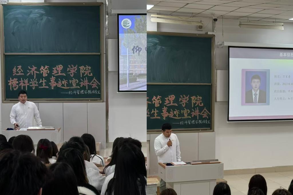 宣讲会上,万家豪学长从学习实践、成长路径等方面进行了经验分享。身为中共预备党员的他,不仅在院校的学生组织均担任要职,而且积极参与志愿服务和社会实践活动。与此同时过去两年他的成绩斐然,连续四学期学习成绩及综测排名专业第一,曾荣获铁人式优秀学习标兵、2024年国家级奖学金等多种荣誉称号及奖项。万家豪学长不仅是一名品学兼优的学生,也更是经管学子矢志不渝追求的目标。