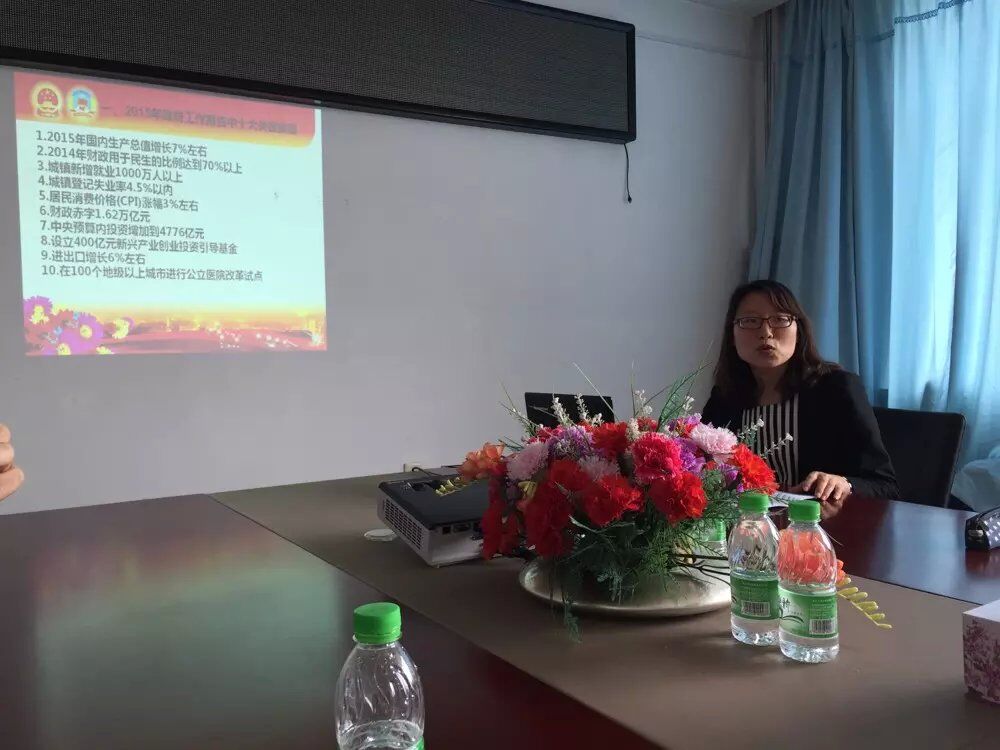 会上,李媛媛同志首先从十大关键数据、十一项新承诺、六大改革热点等三方面对2015年政府工作报告进行解读,并结合自己所学专业对“两会”财税改革热点进行重点讲解;王植荔同志从互联网金融、稳健货币政策、服务实体经济、多层次资本市场体系等方面对“两会”金融改革进行解读;彭良英同志从深化改革、反腐倡廉、就业创业、聚焦三农、深化国企国资改革等七个方面对“两会”利好企业政策进行解读;孔若东同志结合财管旅游教工党支部实际,对我校七届二次教代会精神和2015年学院的重点工作进行解读。