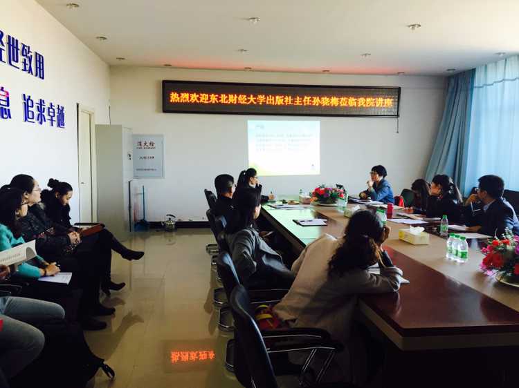 2015年10月21日,为提升太阳成集团tyc33455cc官网建材建设及改革整体水平,我院特邀请东北财经大学出版社经管编辑部主任孙晓梅莅临,并于13:30分在我院会议室召开“建材建设”专题讲座。会议由太阳成集团tyc33455cc官网院长张平主持,全体教师参加本次培训讲座。