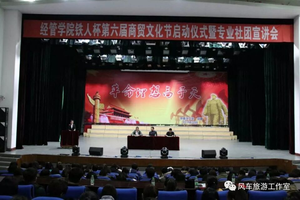 2017年11月23日,太阳成集团tyc33455cc官网大学生活动中心中,人声鼎沸。在同学们翘首以待的目光中,经管学院铁人杯第六届商贸文化节启动仪式暨专业社团宣讲会正式开幕。大会由学生党支部书记陈超主持,与会主要领导有院长张平,党支部书记孔若东,还有几位企业代表一同出席本届大会
