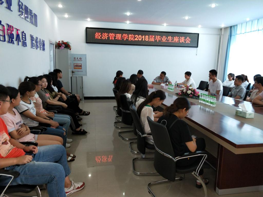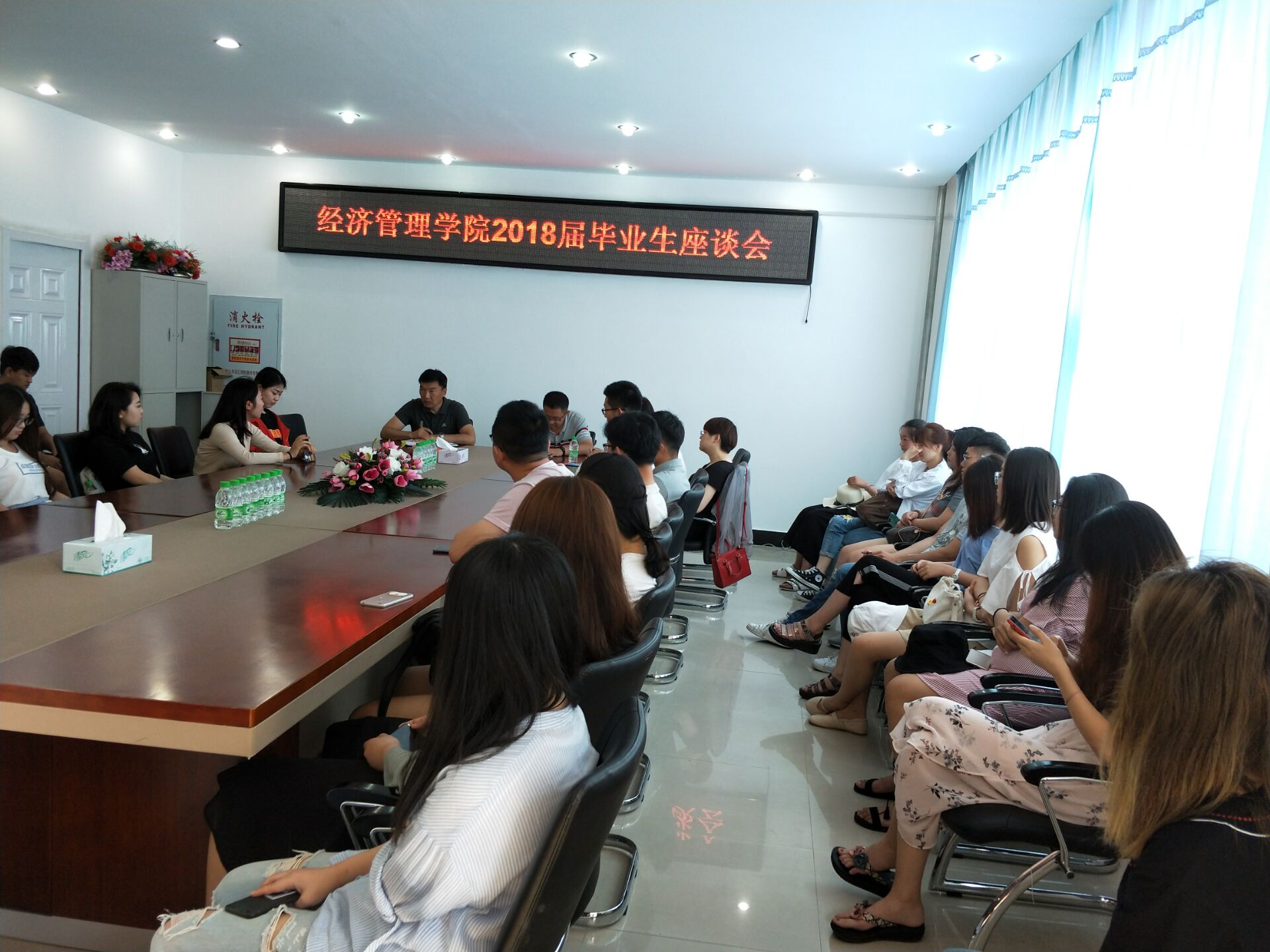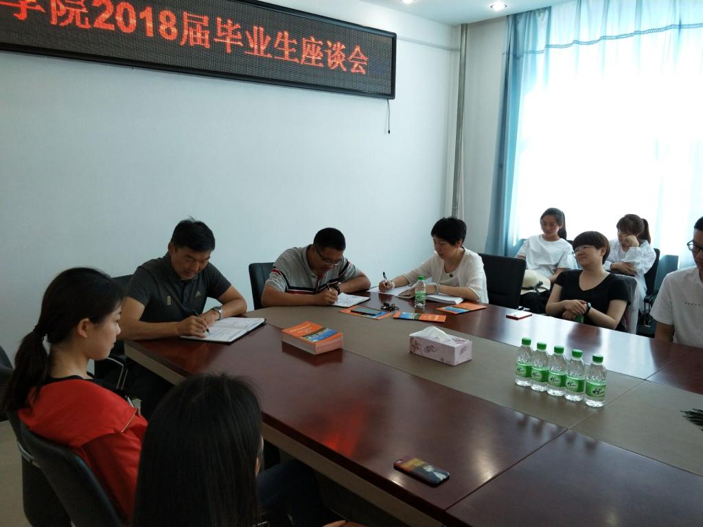 2018年6月22日8:30,太阳成集团tyc33455cc官网在五教402召开2014级毕业生座谈会,学院党总支书记孔若东、院长助理刘楠、市场营销系主任尚德萍、旅游管理系主任车鑫等参加会议,2014级各专业学生代表共计近40人参加会议。