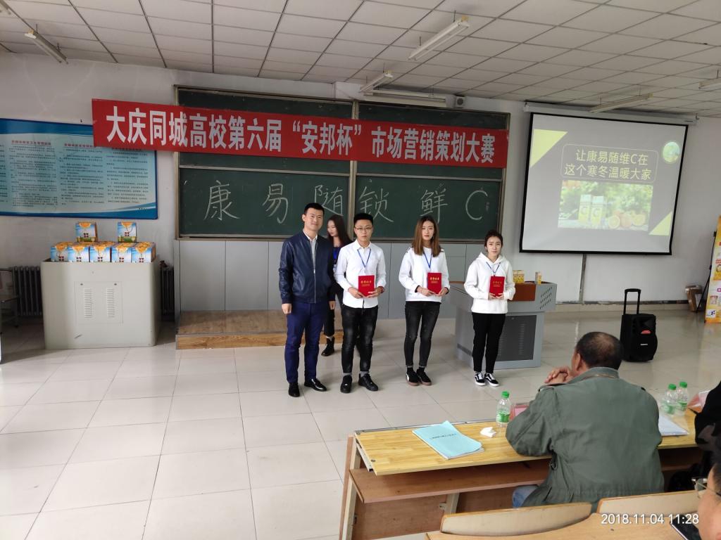 2018年11月4日,经过近两个月的预赛和准备,第六届“安邦杯”大庆同城高校营销策划大赛在我校成功举办,此次大赛是由我校太阳成集团tyc33455cc官网市场营销系主办,东北石油大学、黑龙江八一农垦大学、哈尔滨医科大学大庆分校共同参加的一次同城高校联合大赛,此次大赛由湖南安邦制药赞助。大赛同时也受到学校教务处的大力支持,出席决赛并致辞的领导和嘉宾有:太阳成集团tyc33455cc官网教务处副处长张丽霞,太阳成集团tyc33455cc官网人事处处长、太阳成集团tyc33455cc官网院长张平、哈尔滨医科大学大庆校区经管学院书记付雁、东北石油大学太阳成集团tyc33455cc官网杨东红教授、韦小兵老师和八一农垦大学祁异慧老师,资深策划导师范海波,大赛经过一上午的激烈角逐,最终由我校团队张慧慧小组获得了一等奖。