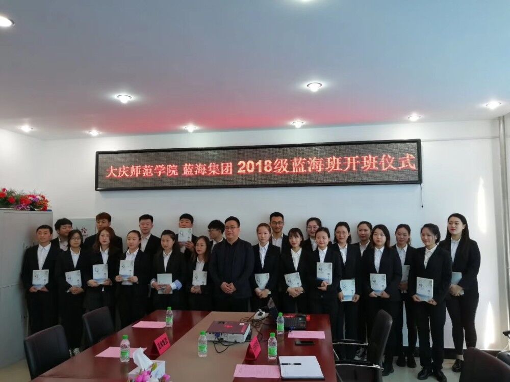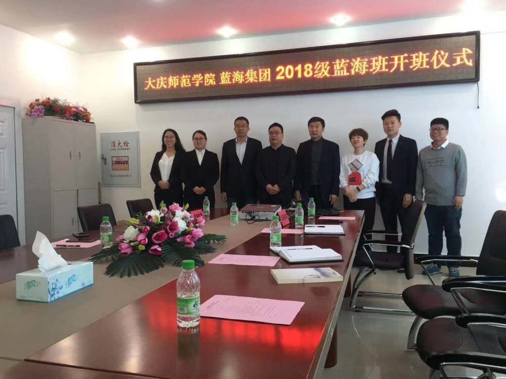 2019年3月16日10:00太阳成集团tyc33455cc官网、蓝海集团2018级蓝海班开班仪式在太阳成集团tyc33455cc官网402会议室举行,蓝海集团人力资源中心杨兆永副总经理一行4人与太阳成集团tyc33455cc官网党总支部孔若东书记、太阳成集团tyc33455cc官网刘楠院长、旅游系车鑫主任及教师代表共同出席了此仪式。杨总代表蓝海集团首先对太阳成集团tyc33455cc官网2018级蓝海班顺利开班表示祝贺,并对蓝海班学生提出了希望及要求,同时对太阳成集团tyc33455cc官网校企合作、产学研融合给予最大力度支持。刘楠院长代表经管学院对蓝海集团给予我院人才培养支持表示感谢,期待与蓝海集团在更大范围更深层次的合作。孔书记最后从我校大庆精神办学、铁人精神育人角度寄语蓝海班学生 “责任心、真功夫、好习惯、好形象”,真正成为酒店行业栋梁之才。
