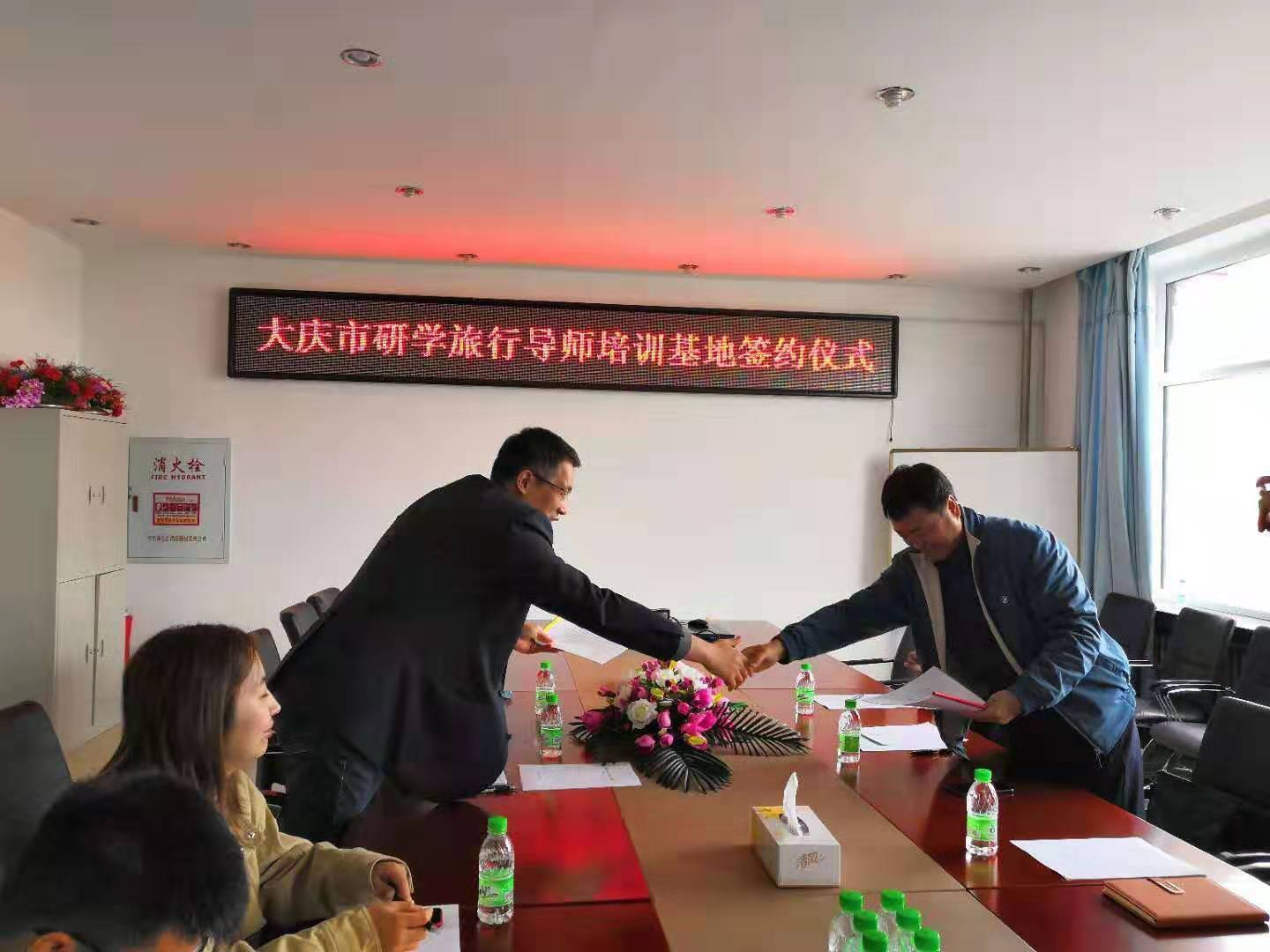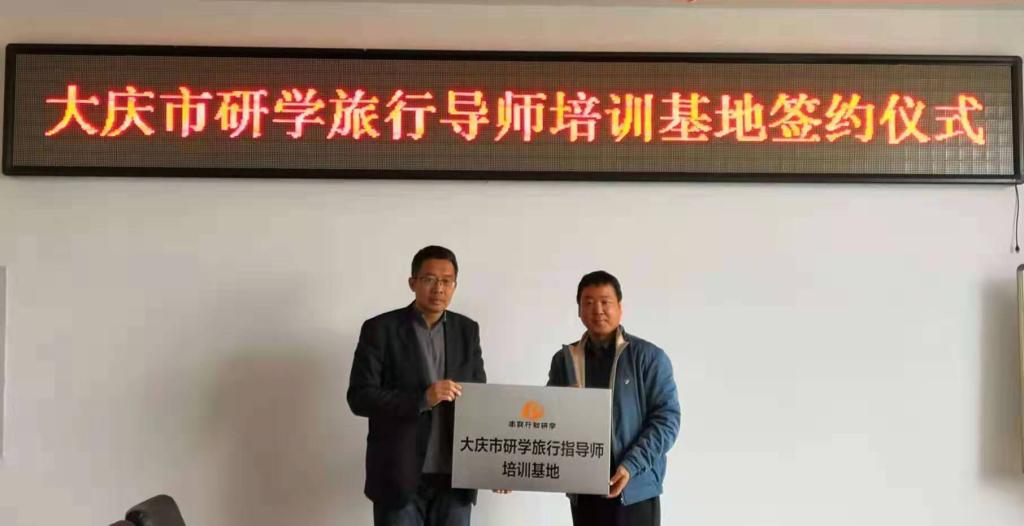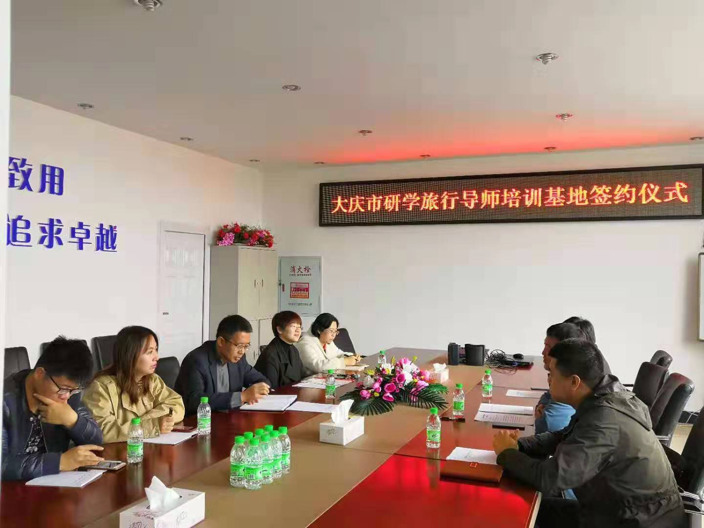 2019年10月28日上午9点,“大庆市串联行知研学指导教师培训基地”签约授牌仪式在我院会议室举行,刘楠院长、行知研学教育公司郭总、研学导师张孟楠、大庆广电旅行社初总参加签约仪式。仪式由旅游管理系主任车鑫主持,旅游管理系骨干教师参与讨论。