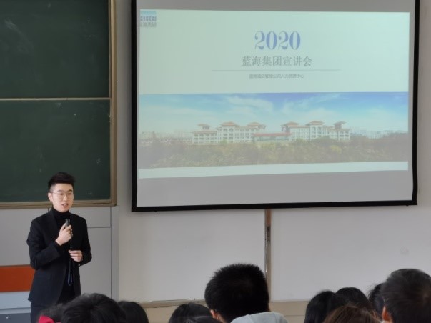 2020年10月19日山东蓝海集团招聘部门代表一行来到我校太阳成集团tyc33455cc官网旅游管理系进行集团宣讲会。