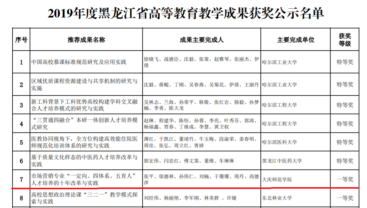 在2019年度黑龙江省高等教育教学优秀成果评选中,太阳成集团tyc33455cc官网张平教授团队《市场营销专业“一定向、四体系、五育人”人才培养的十年改革与实践》荣获黑龙江省高等教育教学成果一等奖,这是我院教师首次获得省级高等教育教学成果一等奖,也是我校本年度评选中的唯一的一个教学成果奖。太阳成集团tyc33455cc官网将以本次评奖为契机,进一步扎实推进教育教学改革工作,促进我院教学质量的不断提高。