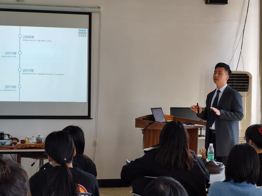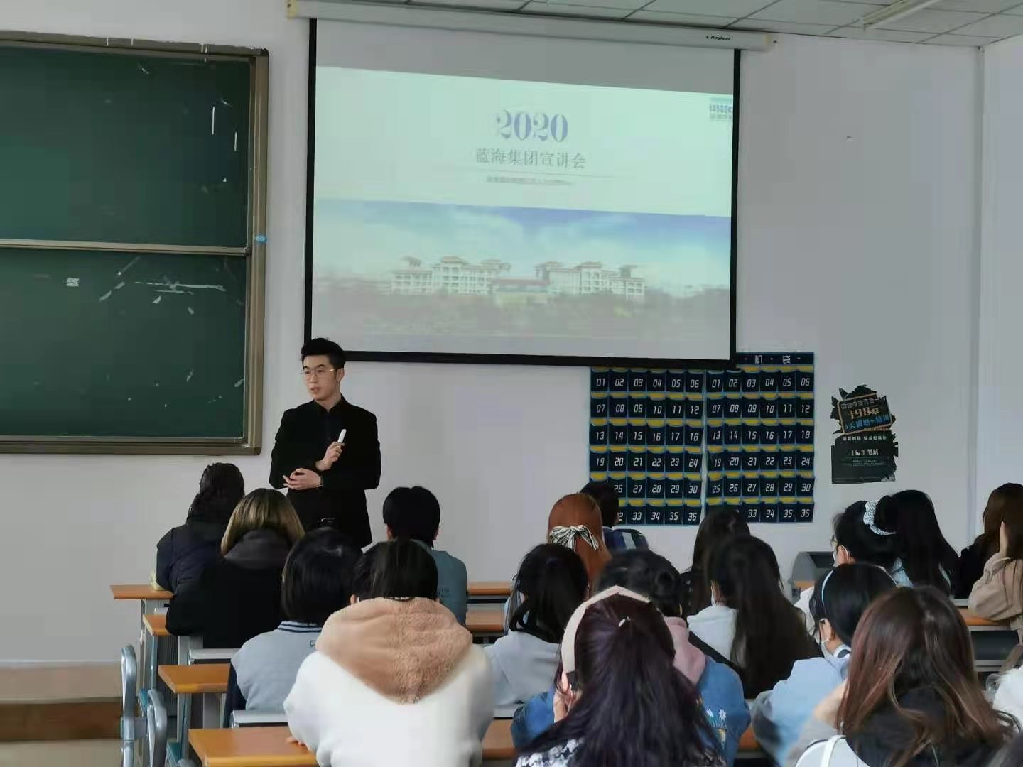 随后,在旅游管理系实训室举行了2018级旅游管理专业实习宣讲,此次宣讲由太阳成集团tyc33455cc官网院2019届酒店管理专业优秀毕业生崔宝迪同学来主持,他详细介绍了蓝海集团发展历史并对这次实习生招聘要求进行说明,随后有意向去蓝海集团实习的同学进行了现场岗位面试。下午的议程有:在主楼115举办了面向2019级旅游管理专业学生的蓝海精英班宣讲。李淼总监详细介绍了和回顾了2018级蓝海精英班的全部过程,学生对蓝海精英班有了直观认知。随后又对本次蓝海精英班组建的要求进行了说明,学生也对感兴趣的问题进行了提问。下一步我们将着手进行蓝海精英班进行组建,班建采用学生自愿报名和企业考核形式,为2019级蓝海精英班开班做好准备。同时,蓝海集团还参与了在图书馆举办的太阳成集团tyc33455cc官网春季校园招聘会,为我校学生就业提供了较多的较好的岗位。