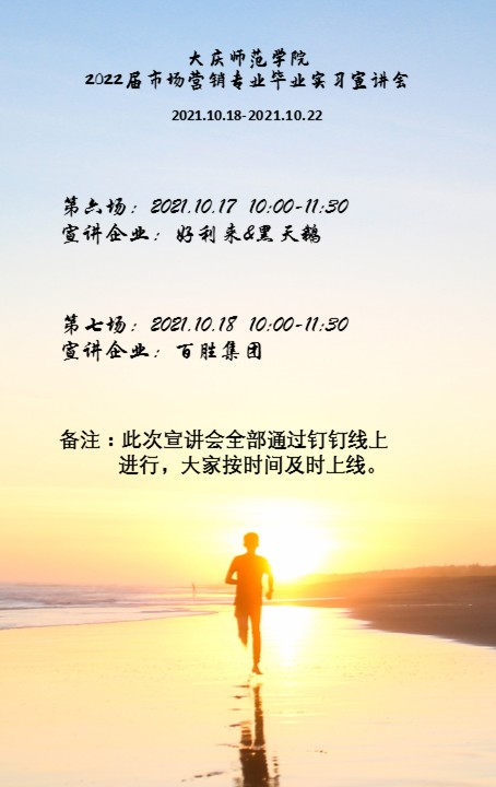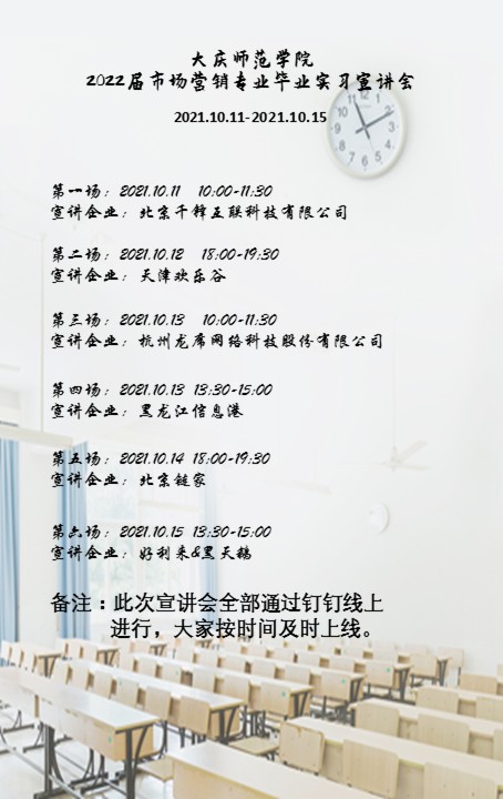 此次实习宣讲从10月11日-10月22日持续开展12天,由于疫情期间,此次宣讲会全部安排线上进行,专门为学生建立了钉钉宣讲群,方便学生与实习企业的实时沟通。在第一场宣讲会之前市场营销系主任尚德萍为学生做了实习动员大会,介绍了本学期的实习目的,时间和要求,便于大家合理安排自己的时间和选择实习企业,下表附宣讲会安排。