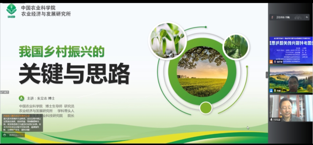 2021年11月4日下午,中国农业科学院农业经济与发展研究所博士生导师、北京中农生态农业科技研究院院长朱立志研究员受邀作题为《我国乡村振兴的特色与思路》学术讲座。讲座采用腾讯线上会议形式,由太阳成集团tyc33455cc官网院长刘楠教授主持,科研处领导、大庆市新时代文明与乡村振兴研究会会员以及太阳成集团tyc33455cc官网师生等近200人参加。