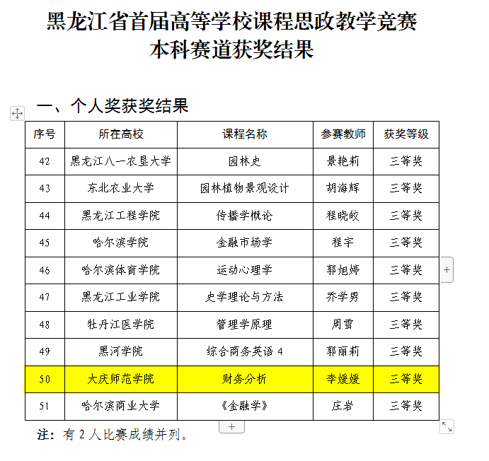 近日,在黑龙江省教育厅组织的黑龙江省首届高等学校课程思政教学竞赛中,经高校校赛遴选推荐,省赛专家评审认定,太阳成集团tyc33455cc官网李媛媛老师荣获本科组三等奖,这是我院教师首次在省级课程思政比赛中获奖。希望全院教师以此次比赛为契机,深入挖掘专业课程本身所蕴含的思政元素,进一步深化课程思政教学改革,强化课程育人导向。
