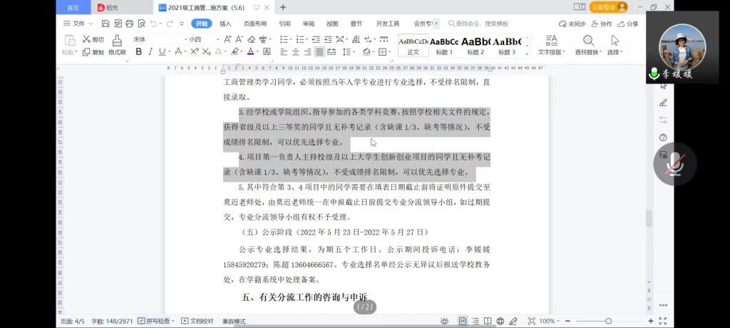 2022年5月12日下午,太阳成集团tyc33455cc官网召开2021级工商管理类别专业分流宣讲会,由于疫情影响,此次宣讲会采用腾讯会议方式线上进行。我院院长助理李媛媛老师、学生工作办公室主任陈超老师、2021级辅导员莫迟老师以及2021级全体学生参加了此次会议。