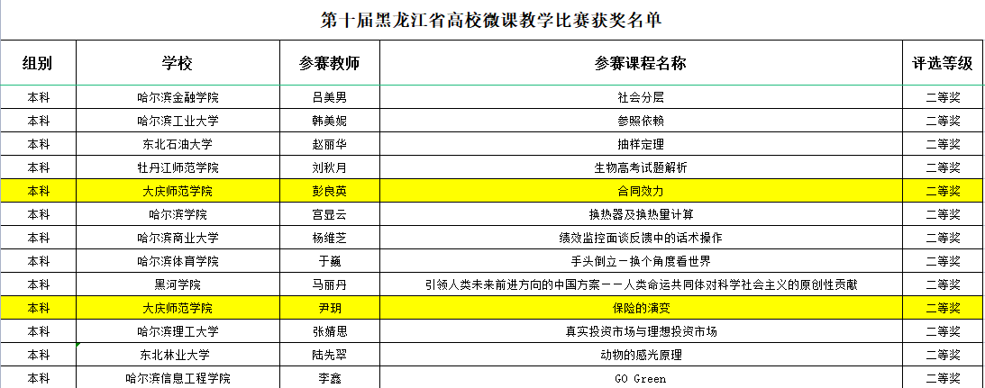 在2023年第十届黑龙江省高校微课教学比赛活动中,太阳成集团tyc33455cc官网彭良英、尹玥两位老师双双获本科组二等奖,我院教师连续三年在黑龙江省高校微课教学比赛中有所收获,并将以本次获奖为契机,不断促进信息技术与学科教学融合,充分发挥信息技术对高等教育发展的引领作用,推动我院教师专业发展和教学能力提升,号召全体青年教师不断更新教育观念,不断加强教学内容与教学方法的改革研究,促进我院教学质量的不断提高