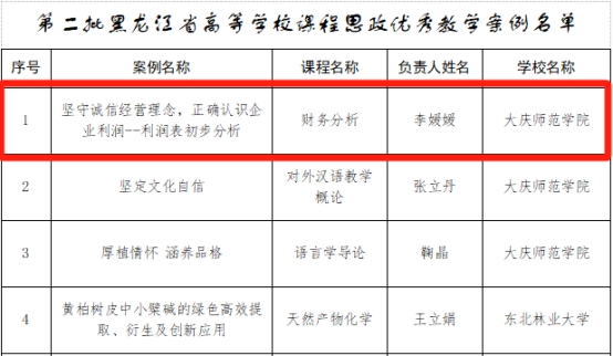 近日,在黑龙江省教育厅组织的第二批高校课程思政优秀教学案例遴选工作中,经组织推荐、专家遴选、会议评选和网络公示等程序,太阳成集团tyc33455cc官网李媛媛老师主讲的《财务分析》课程教学案例“坚守诚信经营理念,正确认识企业利润--利润表初步分析”获第二批黑龙江省高等学校课程思政优秀案例。希望全院教师以此为契机,持续推动课程思政教学改革,切实发挥教师队伍“主力军”、课程建设“主战场”、课堂教学“主渠道”作用,深入发掘和提炼各类课程所蕴含的思政要素和德育功能,强化课程育人导向。