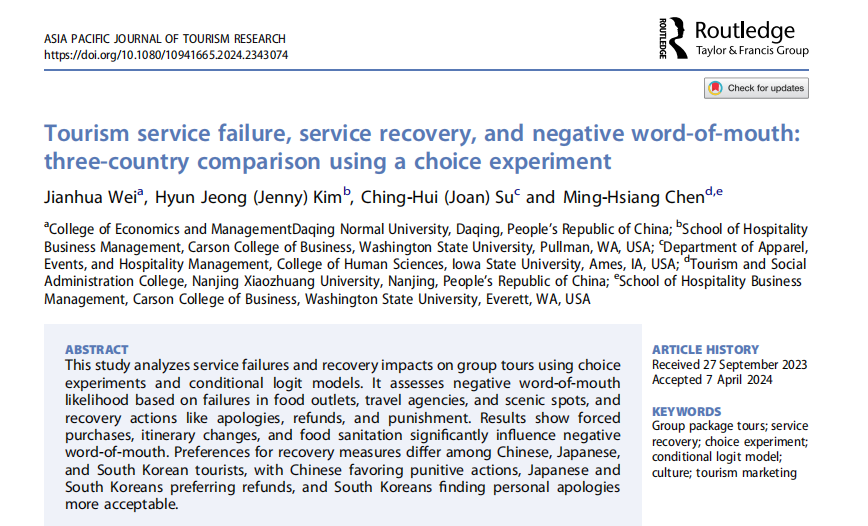 近日,我院韦健华博士与华盛顿州立大学陈明祥教授团队合作,以第一作者,太阳成集团tyc33455cc官网为第一单位,在SSCI检索期刊《Asia Pacific Journal of Tourism Research》,发表论文《Tourism service failure, service recovery, and negative word-of-mouth: three-country comparison using a choice experiment》。该期刊目前在中科院SCI检索分区中处于旅游、休闲、体育研究领域的三区。