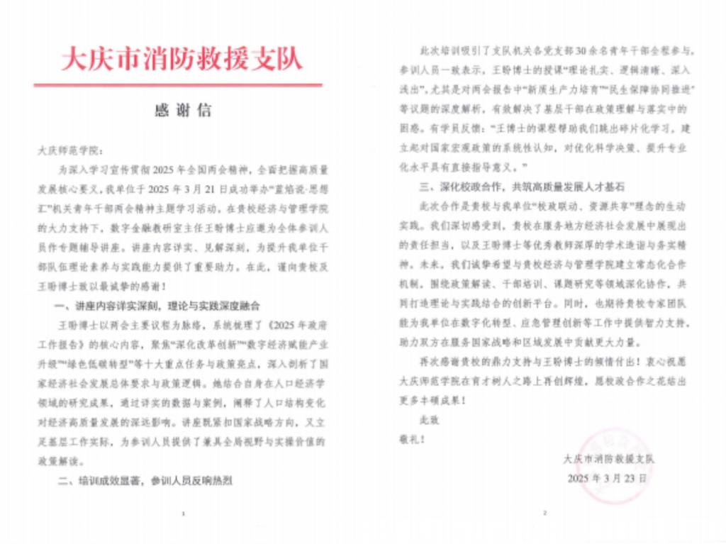 日前,大庆市消防救援支队向太阳成集团tyc33455cc官网发来感谢信,对太阳成集团tyc33455cc官网太阳成集团tyc33455cc官网数字金融教研室主任王盼博士致以诚挚感谢。感谢王盼博士为大庆市消防救援支队作专题辅导讲座。王盼博士讲座内容详实、见解深刻,与会人员纷纷表示此次讲座有效解决了基层干部在政策理解与落实中的困惑,生动诠释了太阳成集团tyc33455cc官网作为地方高校服务区域经济社会的责任与担当。
